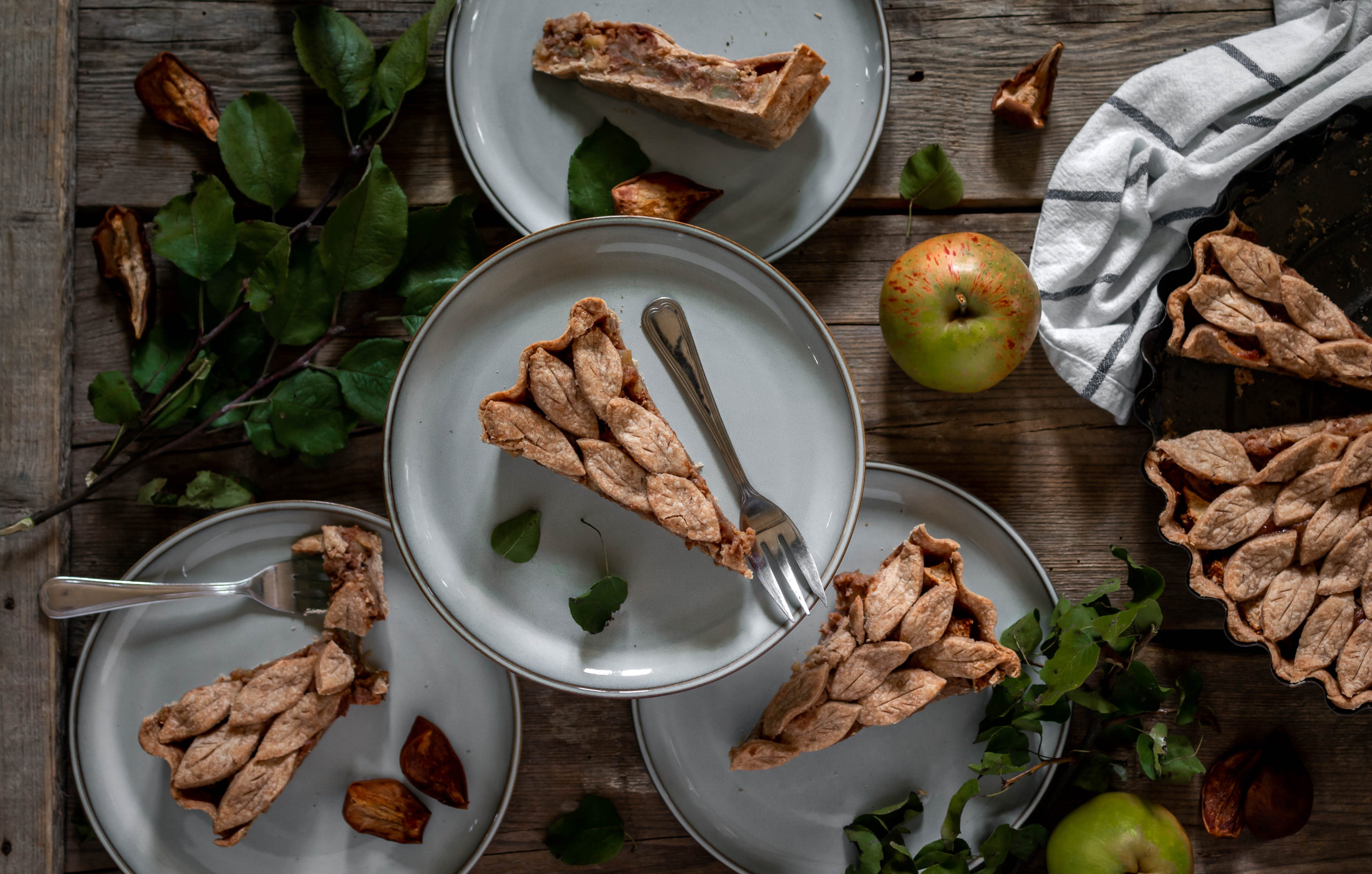Peter’s grandma and I have been trying to use these apples for weeks now and it’s not over yet. We’ve been trying to use the apples in vanilla puddings, mousses, pies, strudels, smoothies, compotes … But no matter what we make, THIS apple pie with caramel sauce is the best.